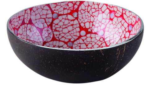 Kokosnussschale, innen rot lackiert, mit Eierschaleninlay, Dekoschale, nicht für Lebensmittel geeignet, H5/D ca.14